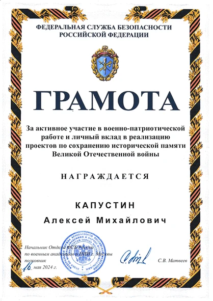 Директор Центра классической и традиционной архитектуры МАРХИ Капустин Алексей Михайлович получил грамоту от ФСБ Российской Федерации за активное участие в военно-патриотической работе и личный вклад в реализацию проектов по сохранению исторической памяти Великой Отечественной войны.